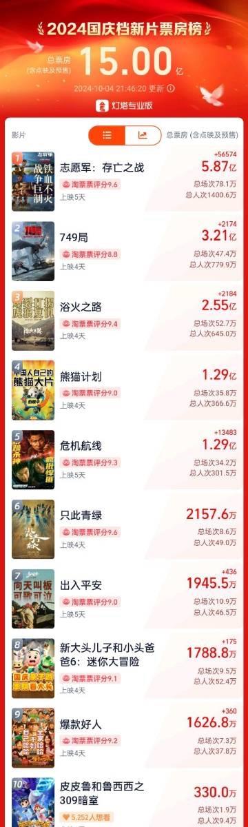 据灯塔专科版,功令10月4日21时46分开云体育,2024年国庆档新片票房(含点映及预售)打破15亿!《志愿军:死活之战》《749局》《浴火之路》暂列新片票房前三名。