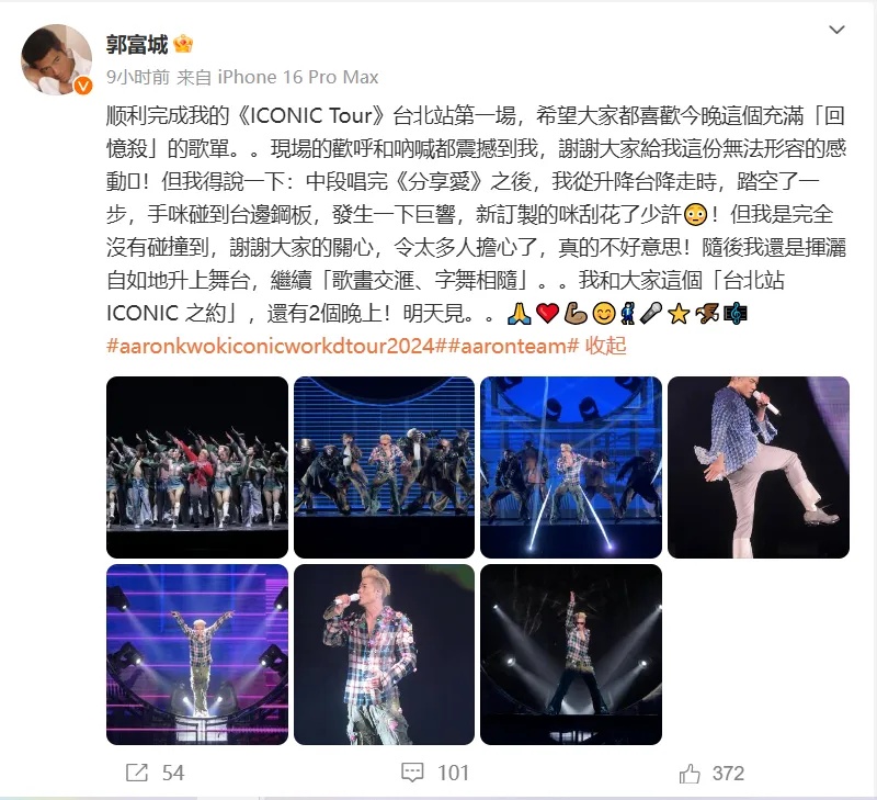 27日晚,还有网友发视频称,知名歌手郭富城在台北小巨蛋举行巡回演唱会时分,不测跌落舞台,还发出巨响。